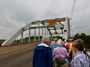 In Montgomery, the group visited three deeply moving sites established by the Equal Justice Initiative: the National Memorial for Peace and Justice (also known as the National Lynching Memorial); the Legacy Museum: From Enslavement to Mass Incarceration; and the Freedom Monument Sculpture Park. In Selma, the group walked across the Edmund Pettus Bridge, which still stands today as a solemn monument to the courage and sacrifice of those who marched across it in 1965, facing down violence and injustice in their quest for equality. In Birmingham, travelers visited “Dynamite Hill” and Kelly Ingram Park, ground zero of Bull Connor’s brutal attack on participants in the Children’s March. In all three cities, masterful tour guides with first-hand experience brought sites of the Civil Rights Movement to life.