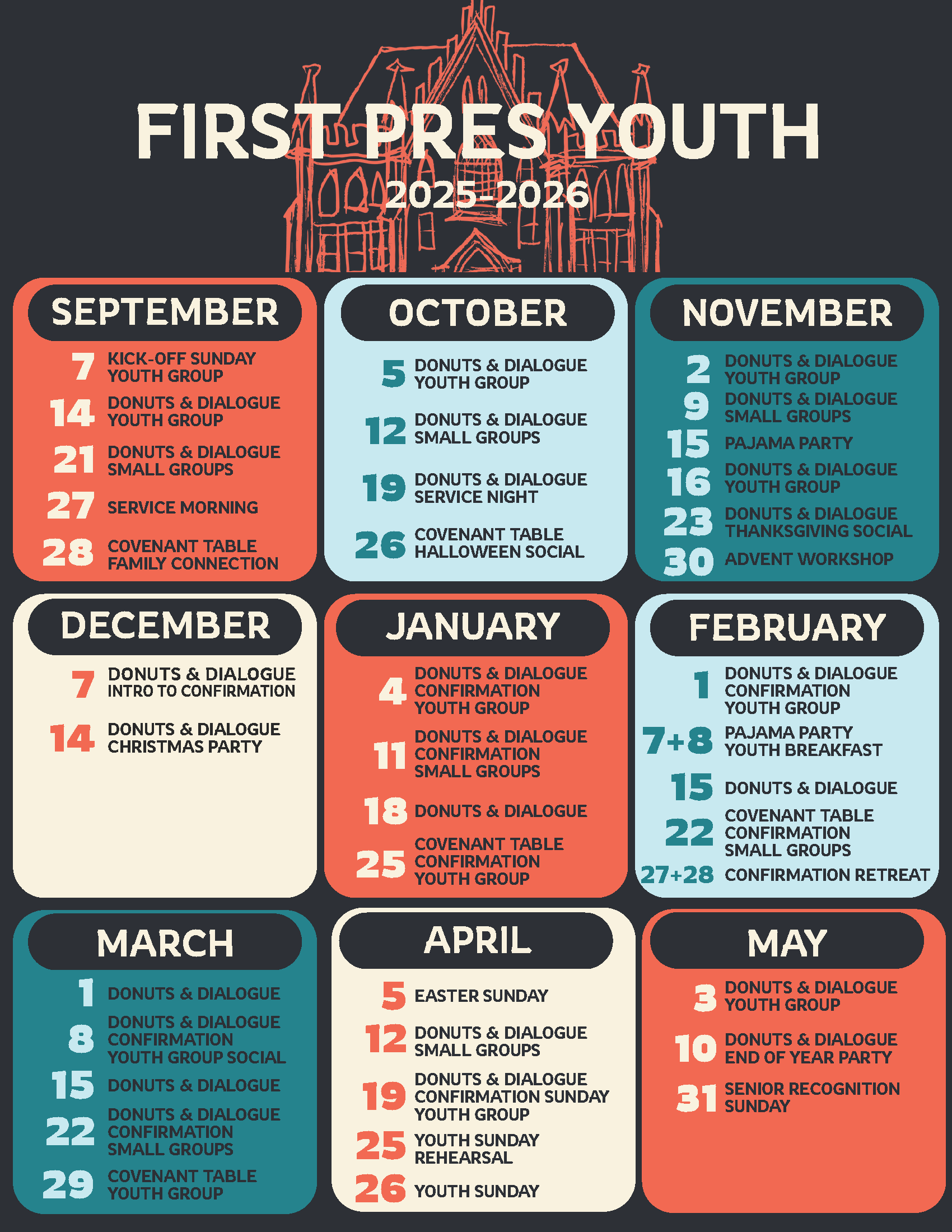 Youth Ministry at First Presbyterian offers space for young people to grow in their faith through fellowship, Bible study, small group discussions. and service. Here, you are beloved, and you belong!